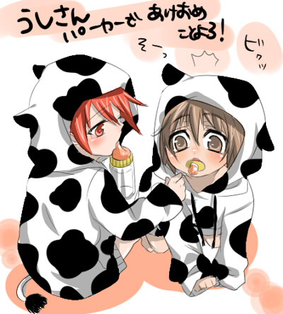 丑年なので、ルークと猿にうし柄パーカー!うしうし!うしもえ!下はおむつ。